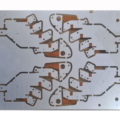 鋁基散熱側(cè)方位白天行車燈柔性線路板,即汽車側(cè)方位日間行車提示(或警示)LED信號燈的基板,汽車日間燈需要長期處于點亮狀態(tài),電量功耗較大,采用單層大面積鋪銅設(shè)計,背面貼裝壓合特定厚度的鋁基散熱片,有效保障能量轉(zhuǎn)換過程中的電熱分離;控制電路增加了LED燈的顯示效果與狀態(tài)監(jiān)測設(shè)計,有效確保日間行車LED燈的智能化升級;相對復(fù)雜的外形結(jié)構(gòu)設(shè)計,引發(fā)此柔性線路基板的壓合加工與成型加工有一定難度。